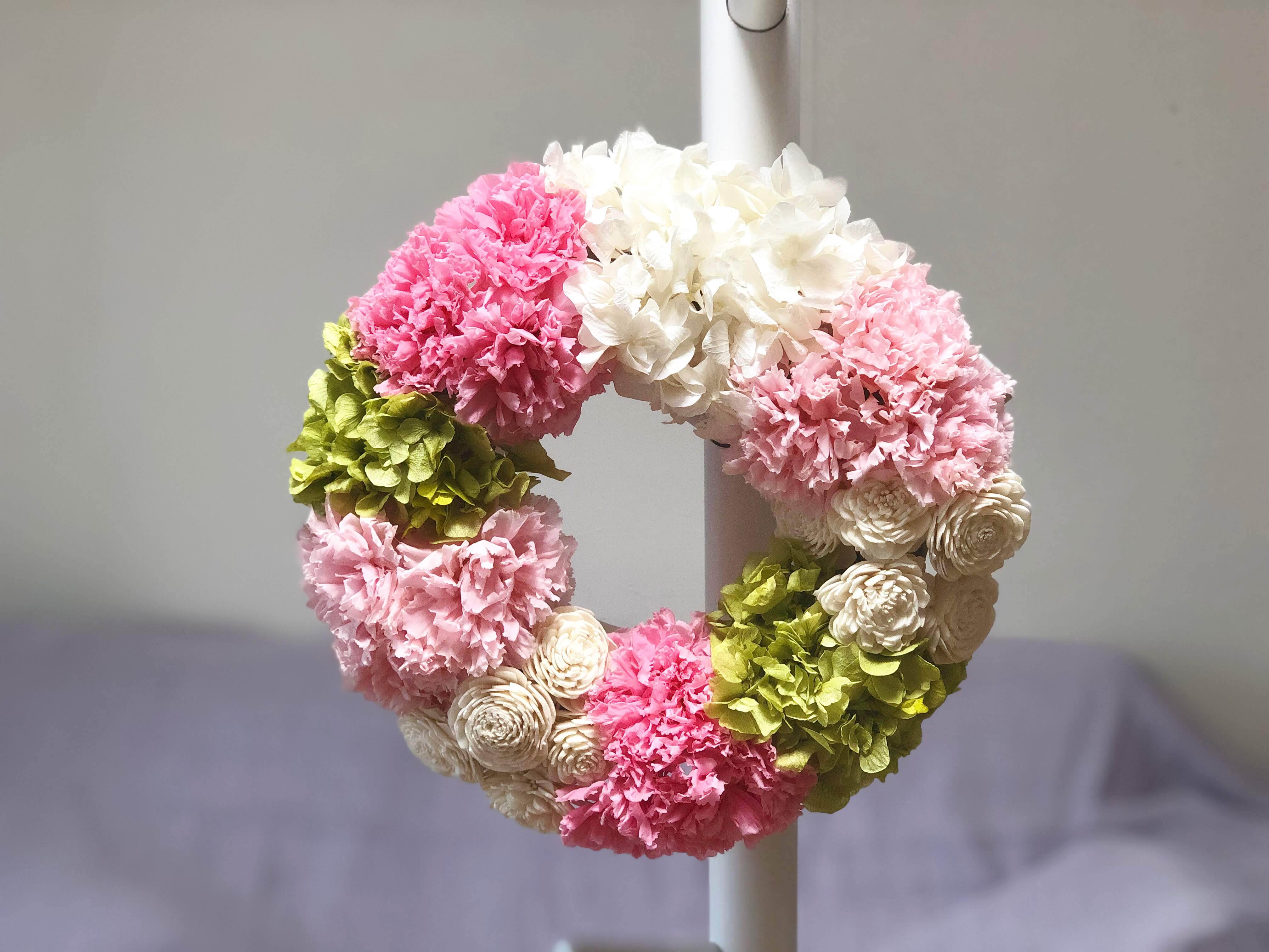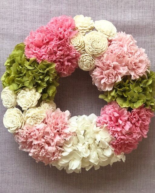 プリザーブドフラワーのカーネーションを贅沢に使用したリースです。