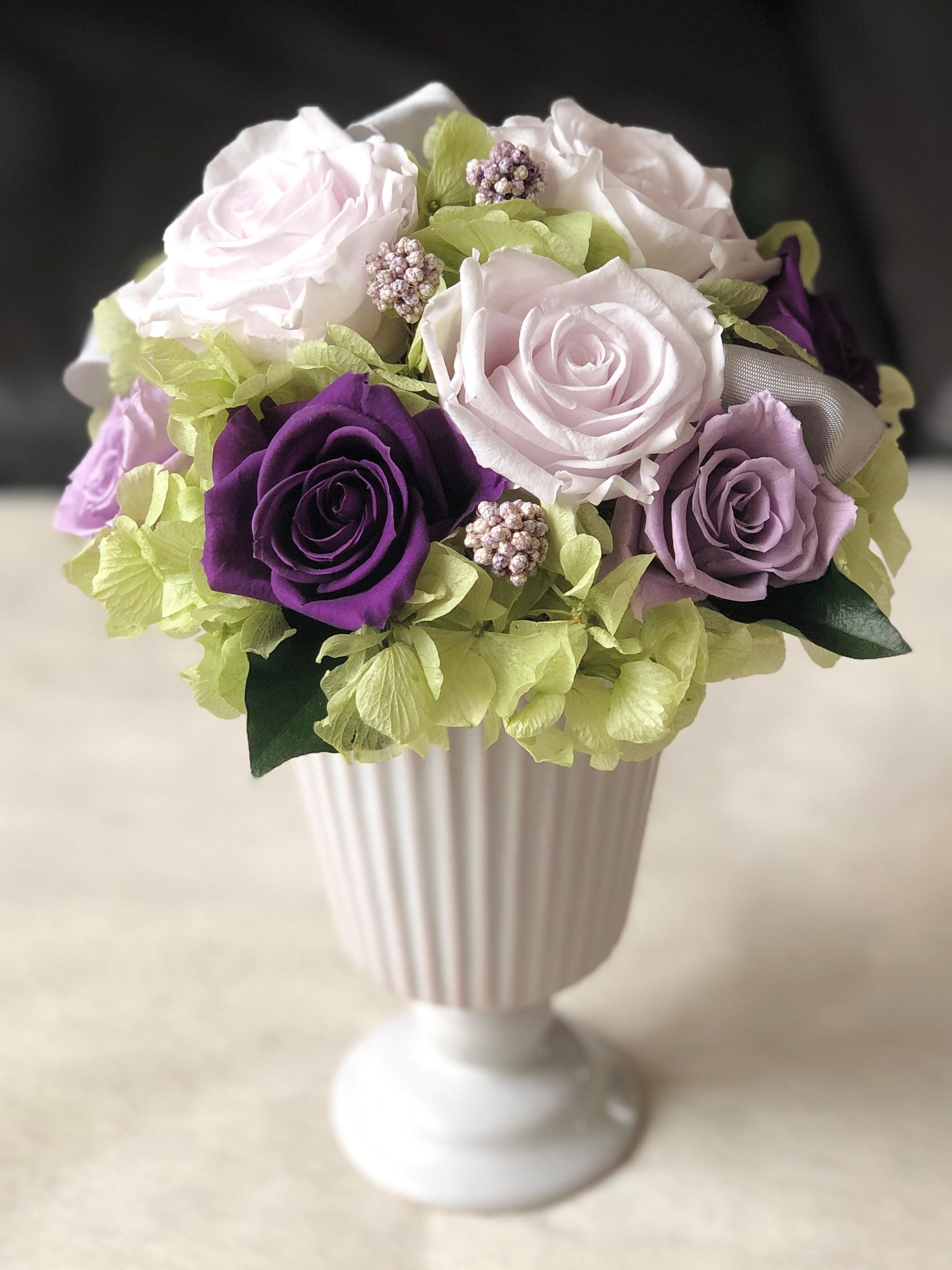 一流メーカーのフロールエバー社のプリザーブドローズを使用したポットアレンジ。